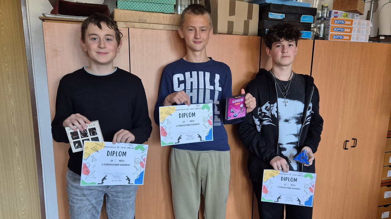 Ve středu 16. 10. 2024 proběhla na naší škole soutěž Přírodovědný klokan, ve které se na 1. místě umístil David Schober z 9.B, na 2. místě Jakub Mokroš z 8.A a na 3. místě Patrik Marszalek z 9.A.