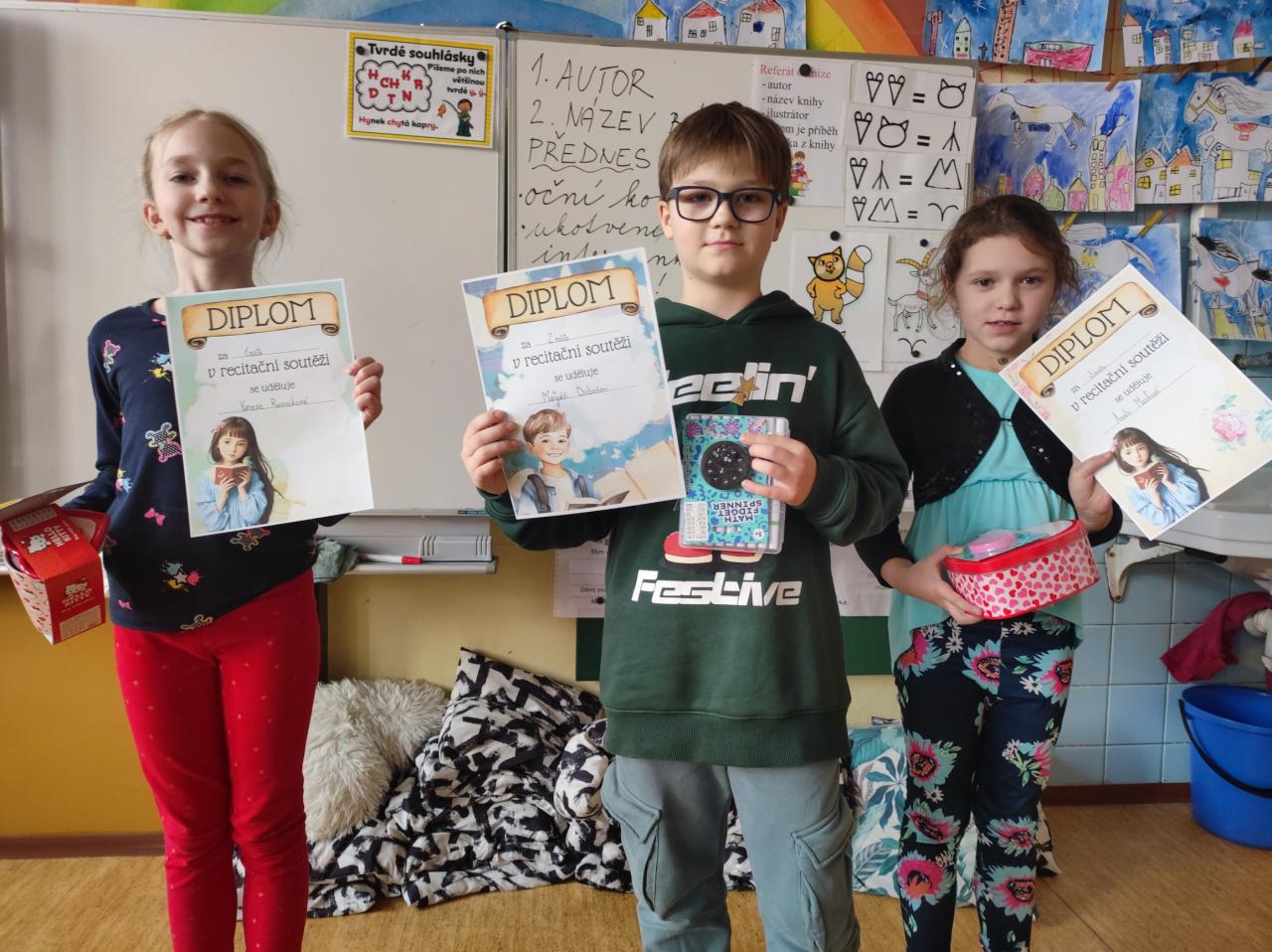 1. místo Vanesa Rusnoková z 2. A, 2. místo Matyáš Doboš z 3.B, 3. místo Amélie Muchová z 2.B